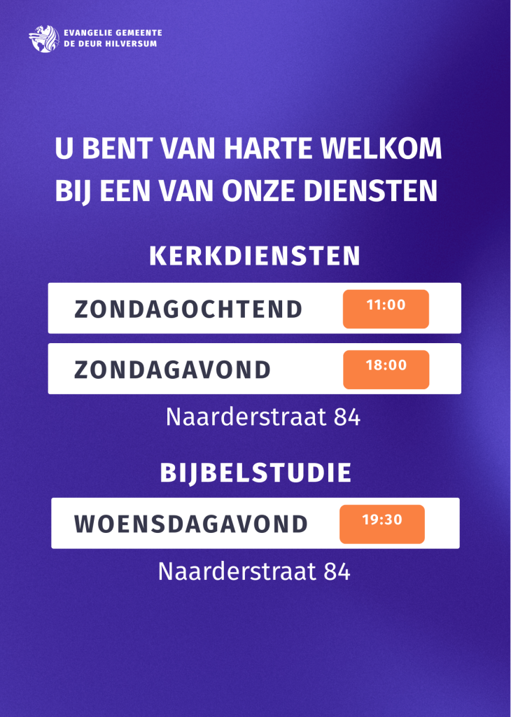 Hartelijk welkom op de website van Evangelie Gemeente De Deur Hilversum! Als evangelische kerk willen we mensen in aanraking brengen met de kracht van het geloof in Jezus. Je bent van harte welkom om een keer langs te komen bij één van onze wekelijkse diensten of activiteiten!